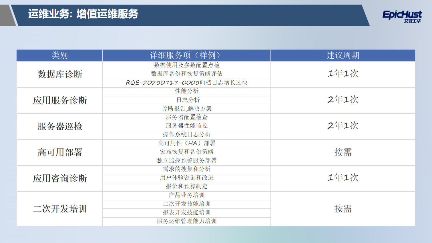 在產(chǎn)品運維基礎上,我們進一步提供增值運維服務,包括但不限于數(shù)據(jù)庫診斷、應用服務診斷、服務器巡檢、高可用部署、應用咨詢診斷和二次開發(fā)培訓。通過深入的問題診斷、細致的日常巡檢、專業(yè)的性能優(yōu)化和定制化的功能補充,我們更有力地預防和解決異常情況,從而進一步提升系統(tǒng)的穩(wěn)定性和可用性,為您的業(yè)務運行提供更全面、更高效的保障。